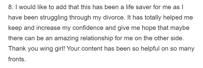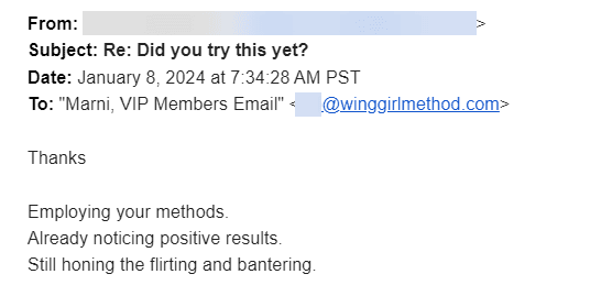 "I can flirt with anyone!!!! Thank you Marni and Wing Girl Team. This is amazing."