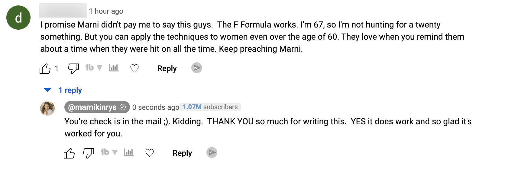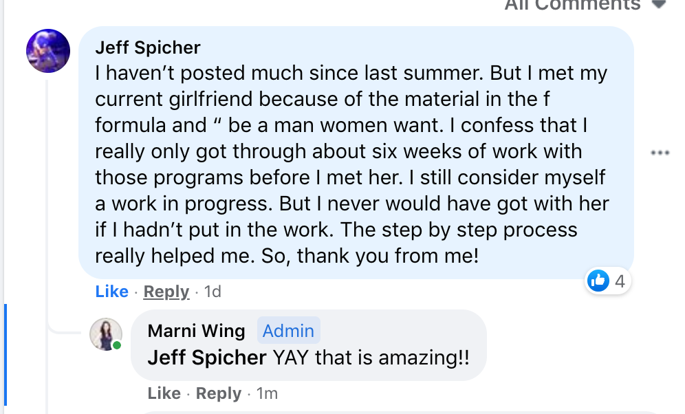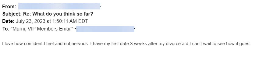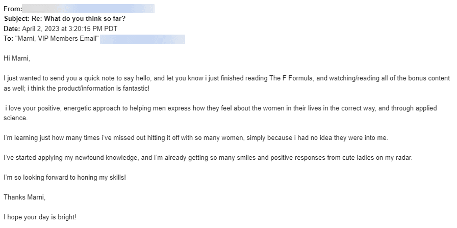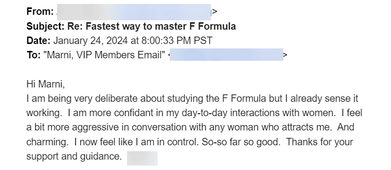 "I signed up after purchasing the F-Formula. I wanted to learn how to talk with women better. I've learned more about women from Marni than I've learned in my entire life.
