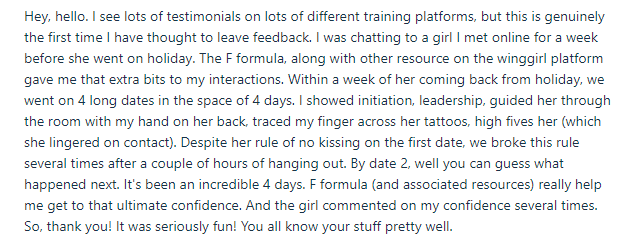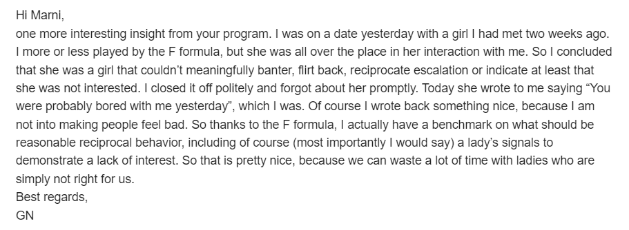 "Dear Marni, I’m new to dating at 40. I’m attractive and confident and able to attract women much younger then me, but was missing a little something on how to close the deal with women. I bought the f-formula and it was just the little boost of info I needed. I made a date with a girl determined to use the approach laid out and the date went well as usual but, she went home with me that same night. The major change being instead laying back I made my intentions clear with her. thanks to the tips I learned in the F-formula. I’m sold on the product. Thank you."