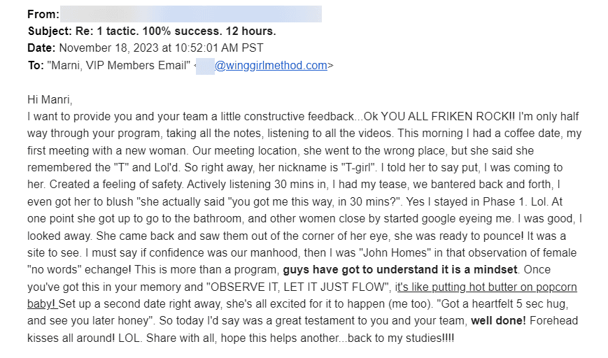 I think the thing that stands out the most about WGM is how I can get the girl by being the best most authentic version of myself. She teaches skills that are in alignment with being a good person. I don't have to be a person I hate to be good at women.